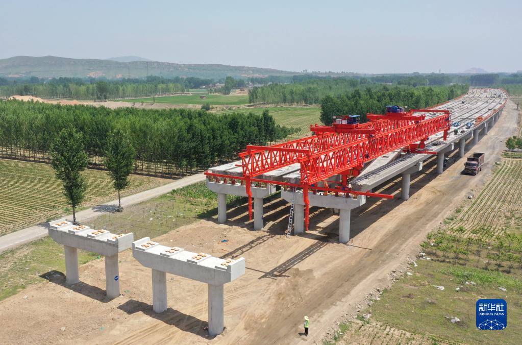 6月8日,工人在河北省昌黎縣境內的秦唐高速三標段建設工地施工(無(wú)人機照片)。