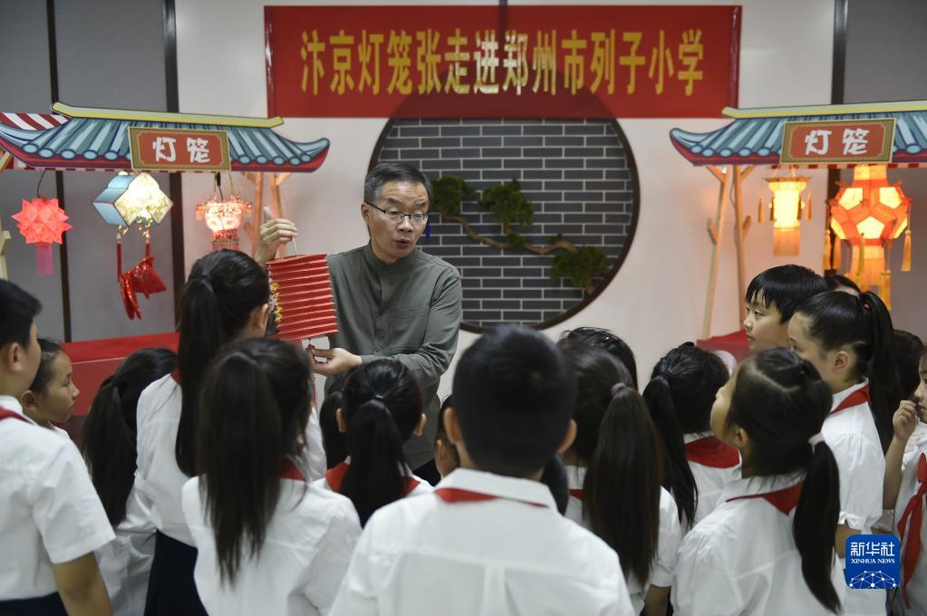 6月8日,張俊濤在鄭州經(jīng)濟技術(shù)開(kāi)發(fā)區列子小學(xué)參加非遺進(jìn)校園活動(dòng),向學(xué)生們介紹彩燈制作技藝。
