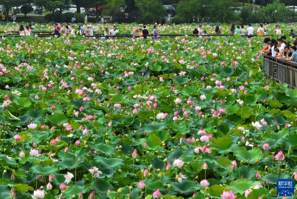6月22日,人們在湖南省衡陽(yáng)市南湖公園賞荷花(無(wú)人機照片)。