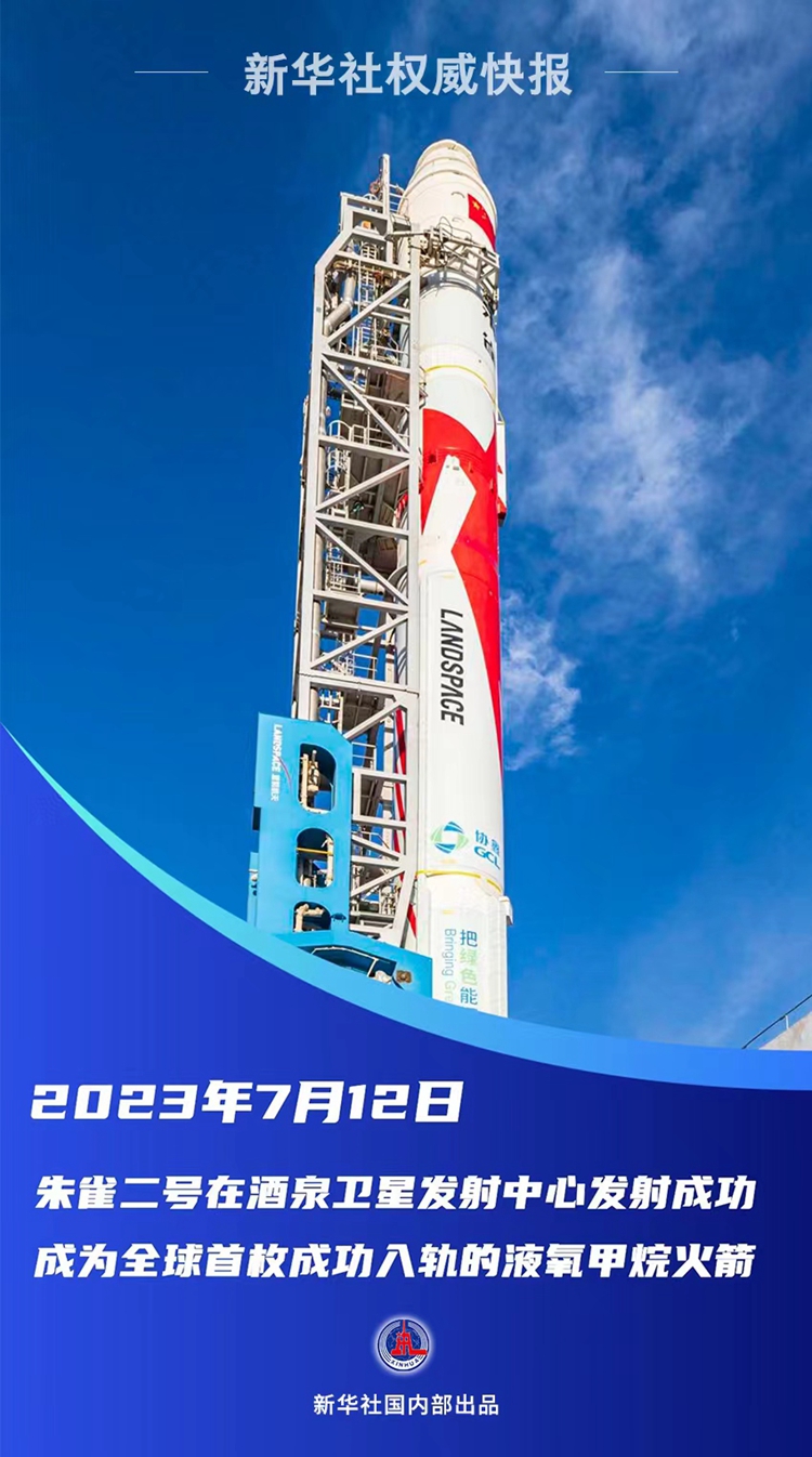 2023年7月12日上午,由藍箭航天空間科技股份有限公司自主研制的朱雀二號遙二液氧甲烷運載火箭在酒泉衛星發(fā)射中心發(fā)射升空,火箭進(jìn)入預定軌道,試驗任務(wù)取得圓滿(mǎn)成功。
