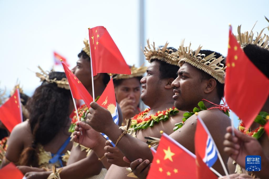 7月15日,中國海軍“和平方舟”號醫院船抵達基里巴斯塔拉瓦,當地民眾手持兩國國旗歡迎“和平方舟”號來(lái)訪(fǎng)。新華社記者 黎云 攝