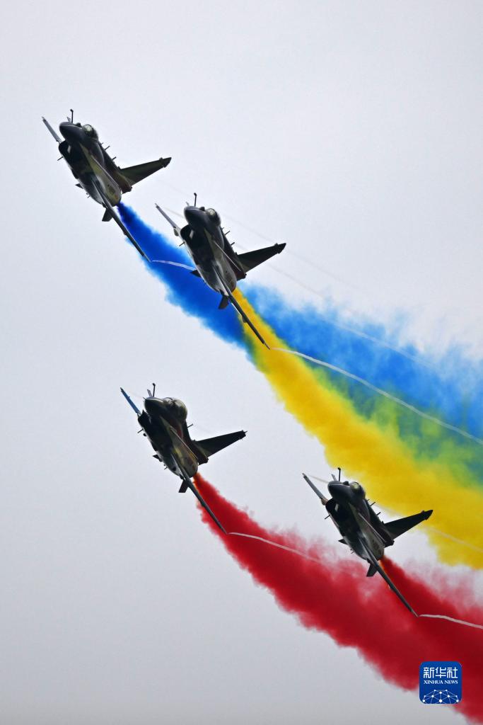 在空軍航空開(kāi)放活動(dòng)·長(cháng)春航空展現場(chǎng),空軍八一飛行表演隊選用代表空軍軍旗色彩的紅、黃、藍三色拉煙,紀念偉大的抗美援朝戰爭勝利70周年。