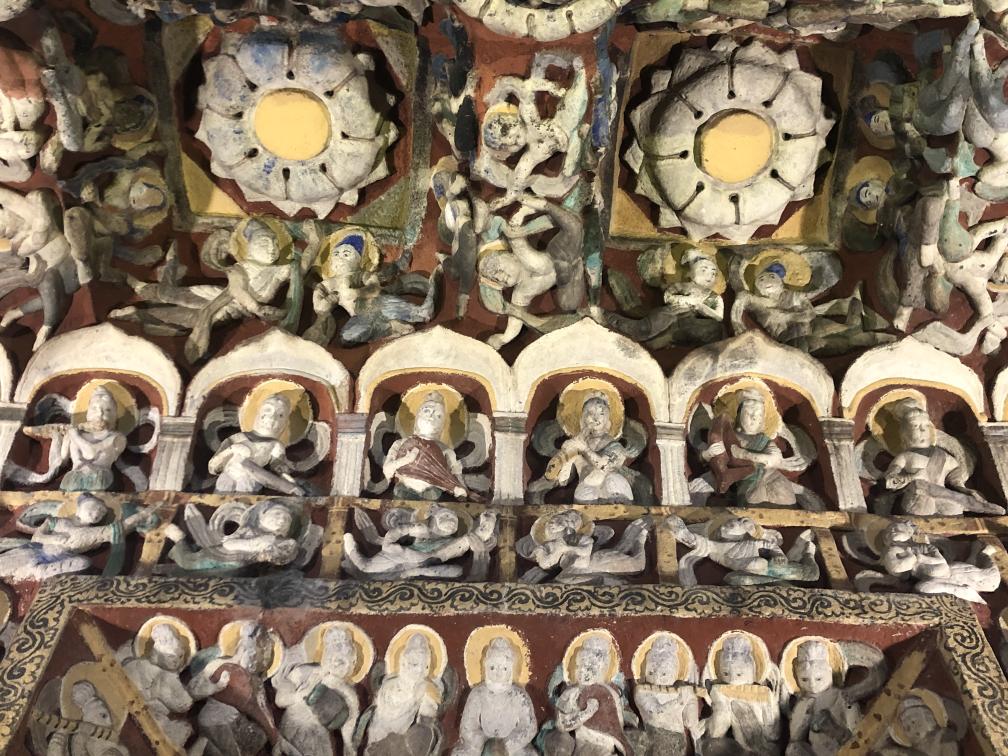 步入第12窟,前室頂部壁上笑意盈盈的“伎樂(lè )天”引人入勝,他們手捧各式樂(lè )器,除了中原漢式琴、箏、簫,還有龜茲細腰鼓、波斯豎箜篌等,仿佛一支整齊的樂(lè )隊,華麗多姿、翩翩起舞。觀(guān)賞間恍如穿越時(shí)空重回當年的音樂(lè )盛典。