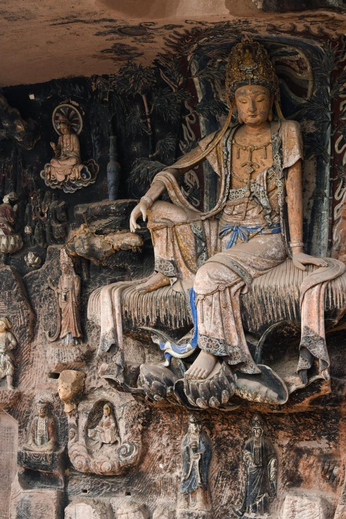 在毗盧洞景區,有一座聞名遐邇的“蹺腳觀(guān)音”造像:不同于常見(jiàn)的觀(guān)音造像,這座觀(guān)音左腳懸于臺外、右腳蹺起,隨意而坐,神態(tài)倜儻,顯得瀟灑自如,悠然自得?!败E腳而立,改變了北方石窟傳統造像正襟危坐、端莊典雅的形象,令人感到非常親民?!睏钚銈フf(shuō)。