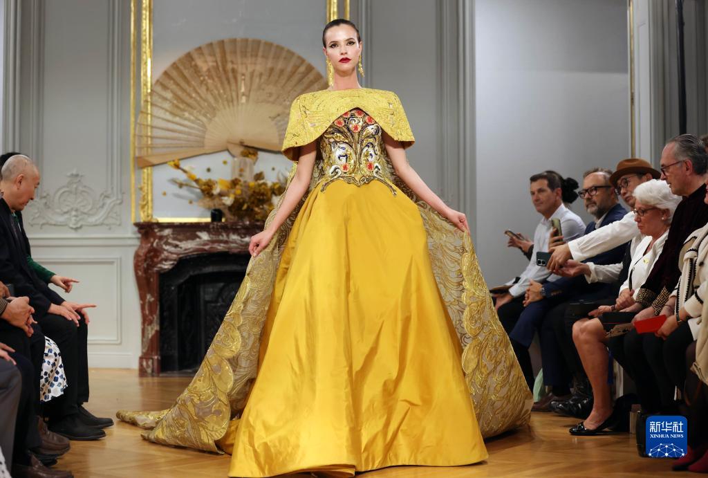 9月27日,模特在法國巴黎中國文化中心舉辦的“恭王府服飾秀”上展示設計師勞倫斯·許創(chuàng )作的恭王府系列高定服裝。新華社記者 高靜 攝