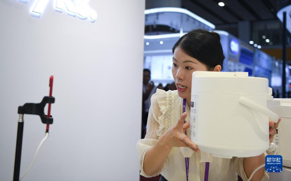 10月15日,參展的工作人員在展臺直播介紹家電產(chǎn)品。新華社記者 鄧華 攝