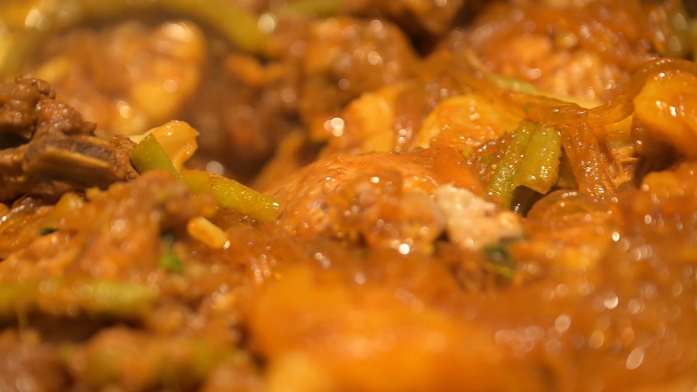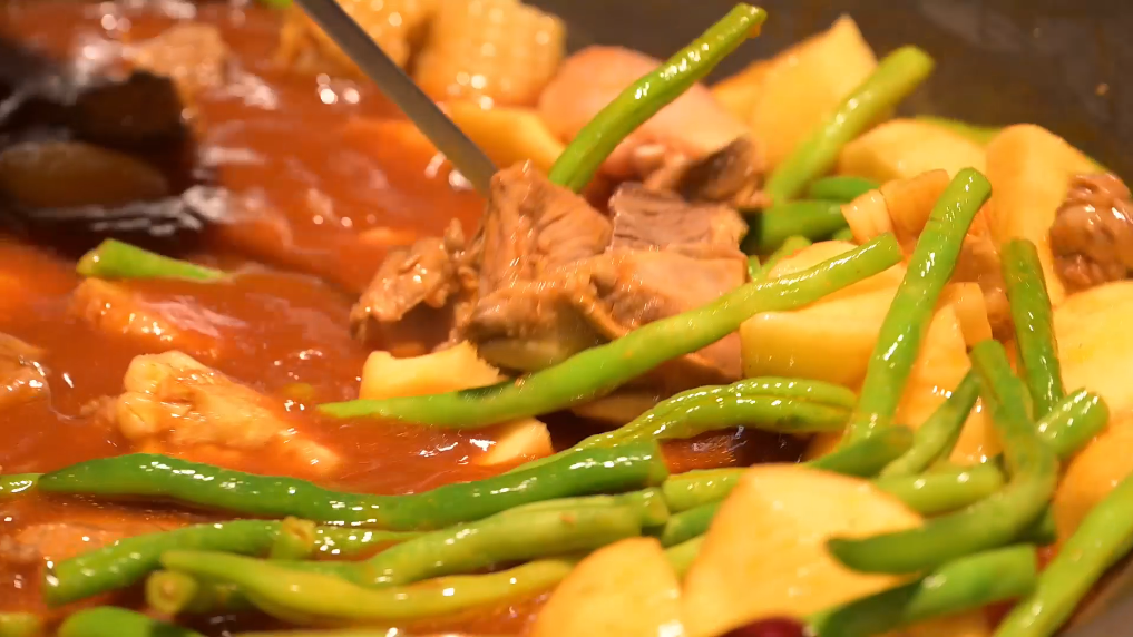 半米的大鐵鍋,似乎能裝下整個(gè)世界——雞翅、土豆、排骨、牛腩、玉米等等等等,各種食材一股腦兒地倒進(jìn)去,萬(wàn)物皆可鐵鍋燉。