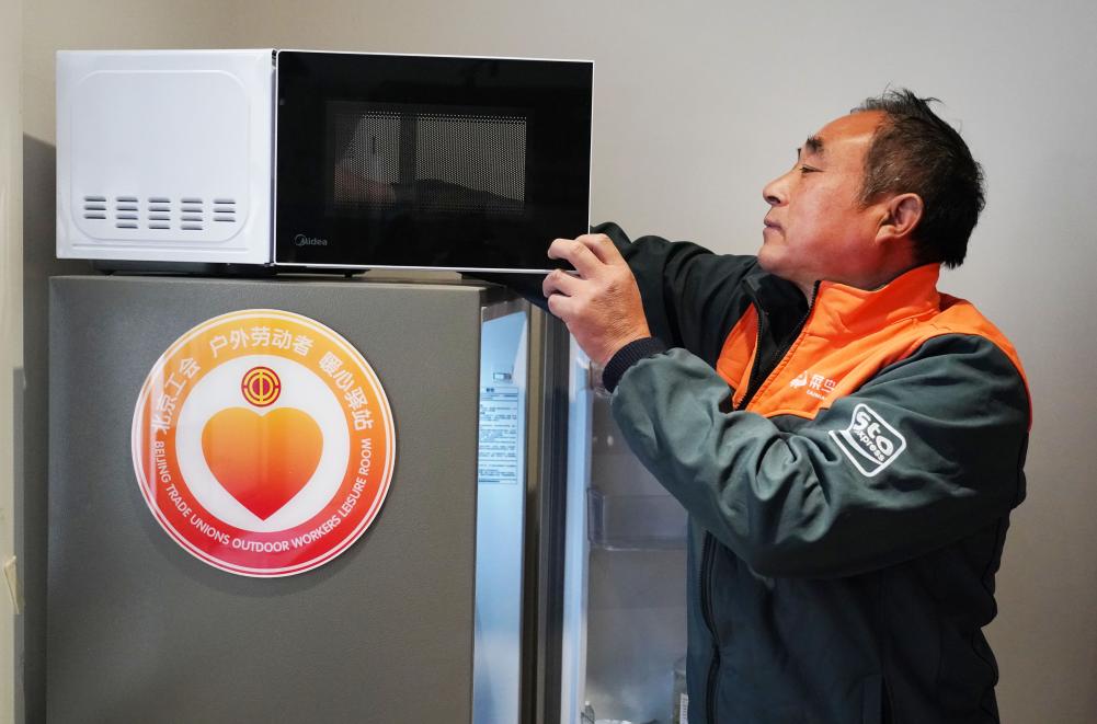 12月13日,快遞員在北京市海淀區學(xué)院路街道二里莊社區服務(wù)中心暖心驛站熱飯。新華社記者 任超 攝
