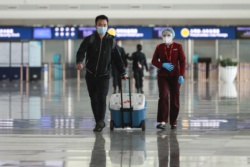 2020年4月24日,武漢協(xié)和醫院心外科醫生盧雄豪(左)運送來(lái)自山東的供肺抵達武漢天河機場(chǎng)。疫情期間該航班取消,移植團隊與中國國際航空公司取得聯(lián)系告知這一情況后,該公司緊急啟動(dòng)綠色通道,重新開(kāi)通此航班。新華社記者 沈伯韓 攝