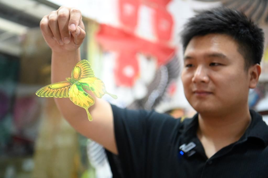 出身風(fēng)箏世家的魏博文大學(xué)畢業(yè)后,回到家鄉跟隨父親魏國秋“入行”做風(fēng)箏。他從自己有所基礎的繪畫(huà)著(zhù)手,發(fā)揮年輕人的創(chuàng )新優(yōu)勢,在風(fēng)箏設計上屢屢出新,不僅與一些游戲公司合作推出風(fēng)箏聯(lián)名款,還推動(dòng)風(fēng)箏制作技藝的改進(jìn)創(chuàng )新,設計了適合在室內放飛的迷你風(fēng)箏。
