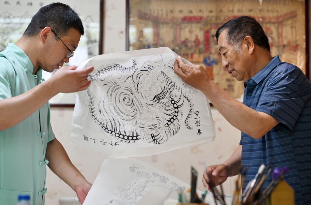 在天津市西青區的楊柳青霍氏古一張畫(huà)店,霍樹(shù)林(左)和父親霍慶有交流下一階段的年畫(huà)制作(6月6日攝)。