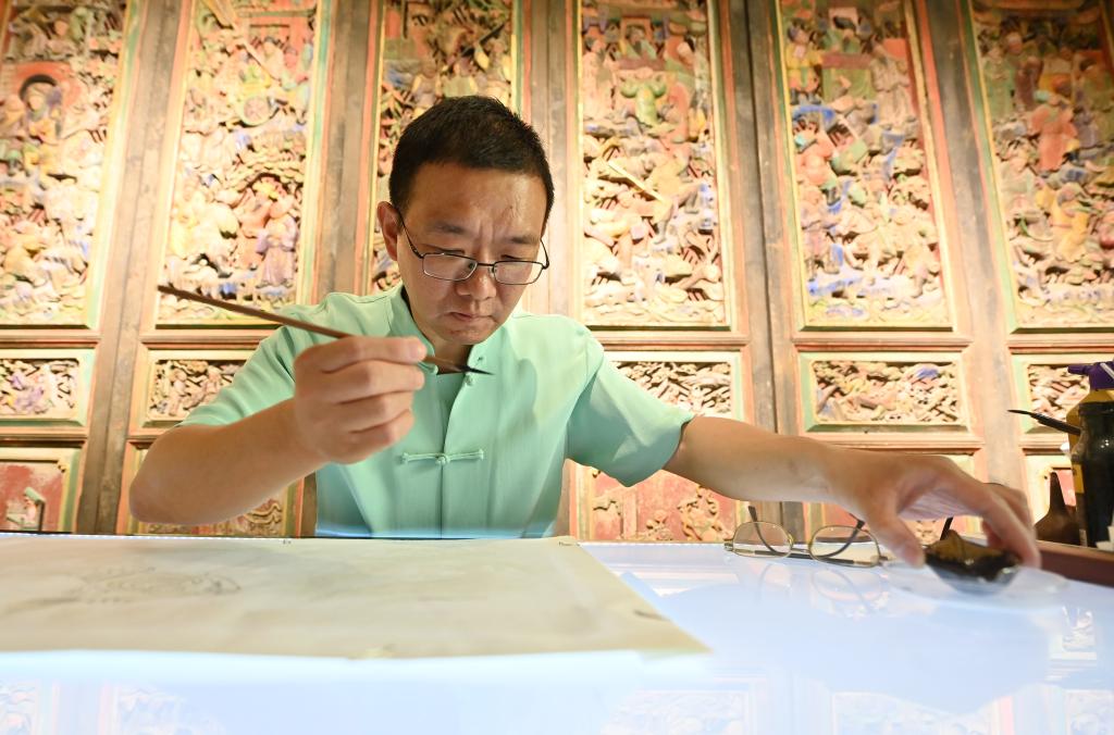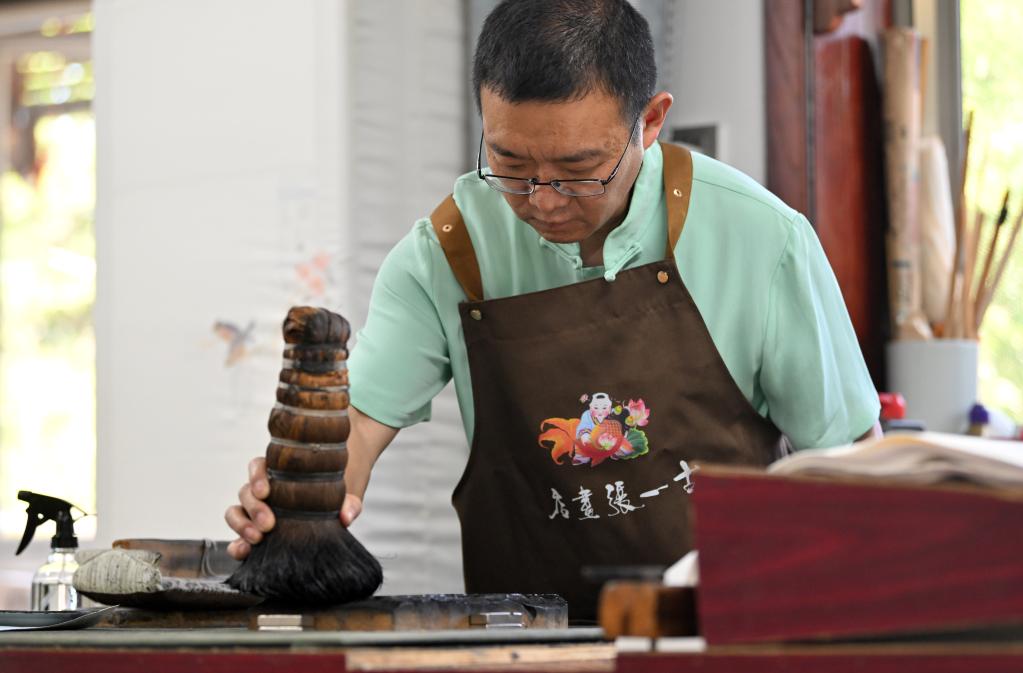 霍樹(shù)林在天津市西青區的楊柳青霍氏古一張畫(huà)店進(jìn)行刷墨(6月6日攝)。