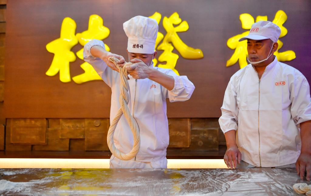 在天津桂發(fā)祥十八街麻花文化館,王洪德(右)為徒弟趙寶陽(yáng)展示搓制成型的麻花(6月8日攝)。