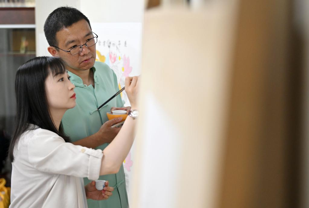 在天津市西青區的楊柳青霍氏古一張畫(huà)店,霍樹(shù)林(右)和妻子王丹一起進(jìn)行彩繪(6月6日攝)。