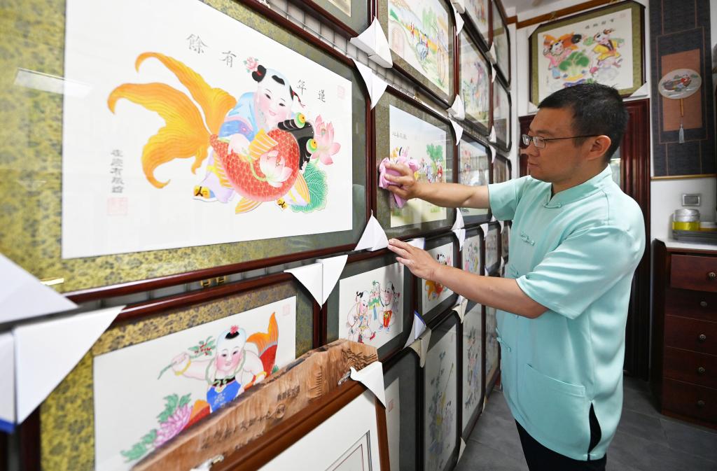 在天津市西青區的楊柳青霍氏古一張畫(huà)店,霍樹(shù)林在用布擦拭畫(huà)框(6月6日攝)。