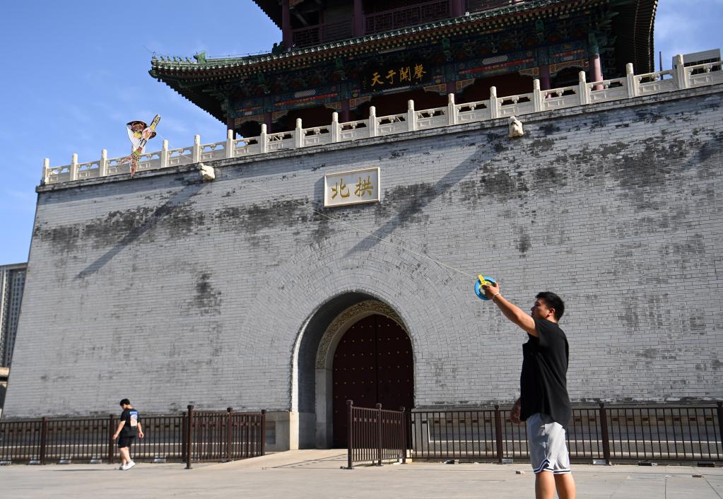 在天津市鼓樓附近,魏博文在放飛一架制作完成的風(fēng)箏(6月8日攝)。
