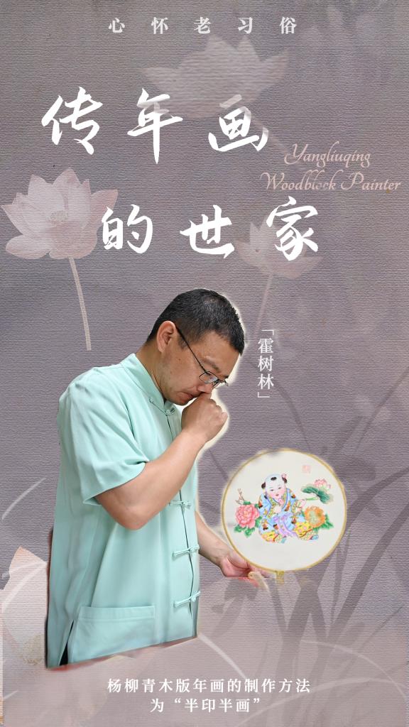 今年42歲的霍樹(shù)林因為出生在年畫(huà)世家,從十歲就開(kāi)始跟著(zhù)父親霍慶有——楊柳青木版年畫(huà)國家級代表性傳承人學(xué)習彩繪,中學(xué)時(shí)接觸勾線(xiàn)、刻版、印畫(huà)等,參加工作以后堅持磨煉裝裱技藝。