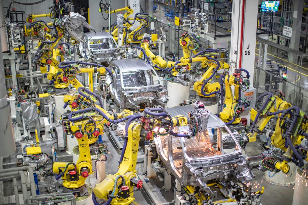 重慶一家新能源汽車(chē)企業(yè)使用智能化焊接機器人進(jìn)行焊接作業(yè)。新華社記者 黃偉 攝