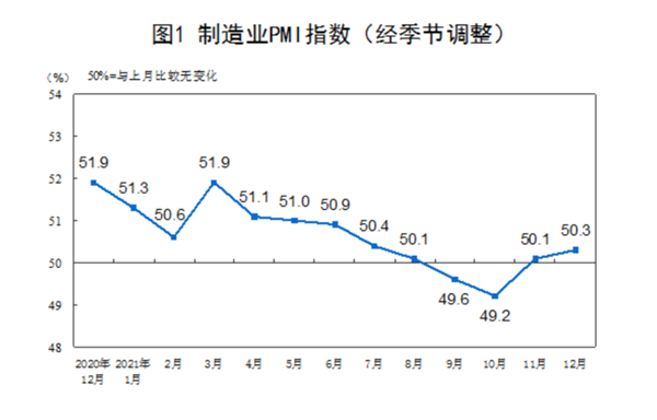 國家統計局服務(wù)業(yè)調查中心和中國物流與采購聯(lián)合會(huì )12月31日聯(lián)合發(fā)布數據顯示,12月份,中國制造業(yè)采購經(jīng)理指數(PMI)為50.3%,比上月上升0.2個(gè)百分點(diǎn),高于50%的臨界點(diǎn)。這一先行指標連續兩個(gè)月回升,顯示出經(jīng)濟運行和市場(chǎng)預期的積極變化。
