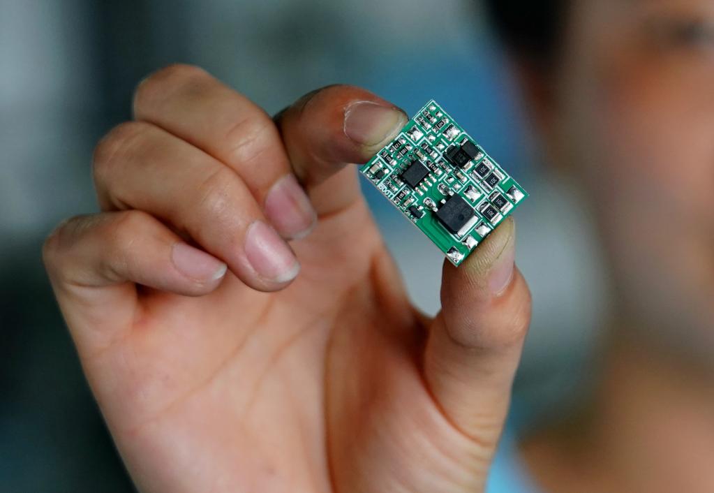 秦皇島經(jīng)濟技術(shù)開(kāi)發(fā)區一家汽車(chē)電器生產(chǎn)企業(yè)的職工展示一款汽車(chē)電器設備的芯片。新華社發(fā)