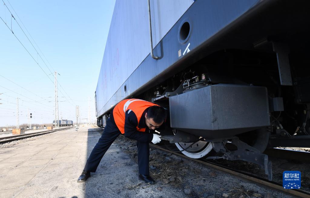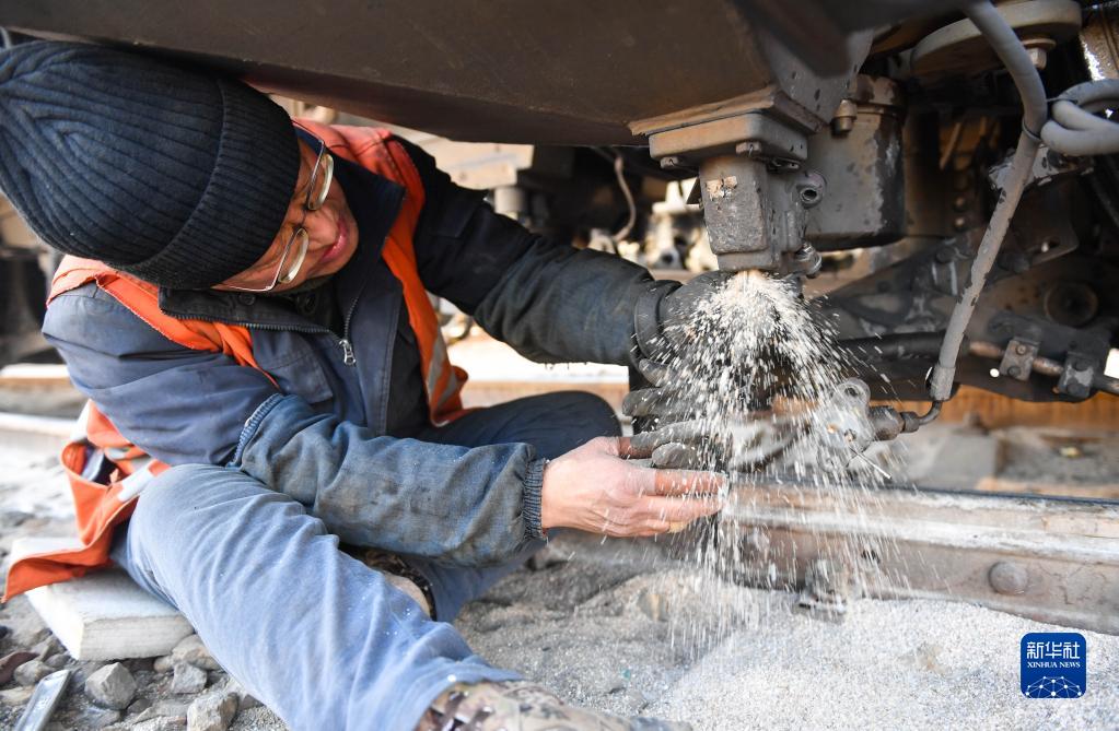 重載司機呼長(cháng)寶在發(fā)車(chē)前檢查列車(chē)(1月20日攝)。新華社記者 柴婷 攝