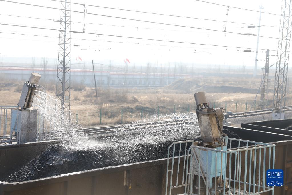 在塔山煤礦的裝車(chē)站,列車(chē)上的煤堆被噴灑抑塵劑(1月19日攝)。新華社記者 陳志豪 攝