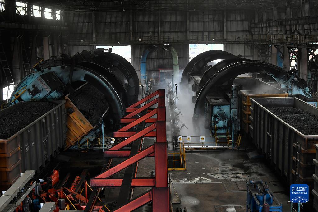 在河北省秦皇島柳村南站的翻車(chē)機房,翻煤機將車(chē)廂內滿(mǎn)載的煤炭倒進(jìn)傳送帶(資料照片)。新華社發(fā)