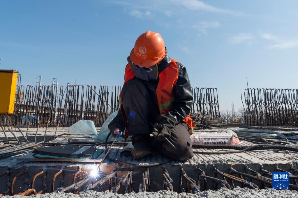 4月3日,在哈爾濱市道外區,工人在中鐵一局北門(mén)街高架工程施工現場(chǎng)作業(yè)。新華社記者 謝劍飛 攝