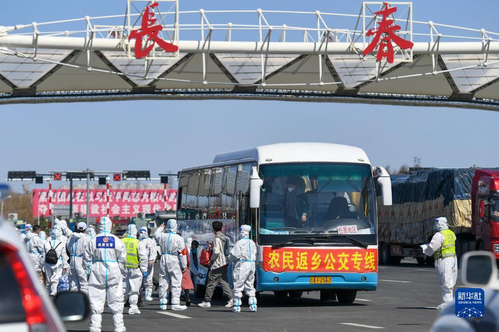 在吉林長(cháng)春高速公路東出口,返鄉農民登上返鄉公交專(zhuān)線(xiàn)(4月12日攝)。新華社發(fā)