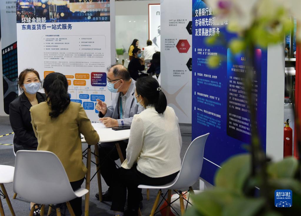 參會(huì )者在第四屆進(jìn)博會(huì )服務(wù)貿易展區大華銀行展臺交流(2021年11月7日攝)。新華社記者 徐亮 攝