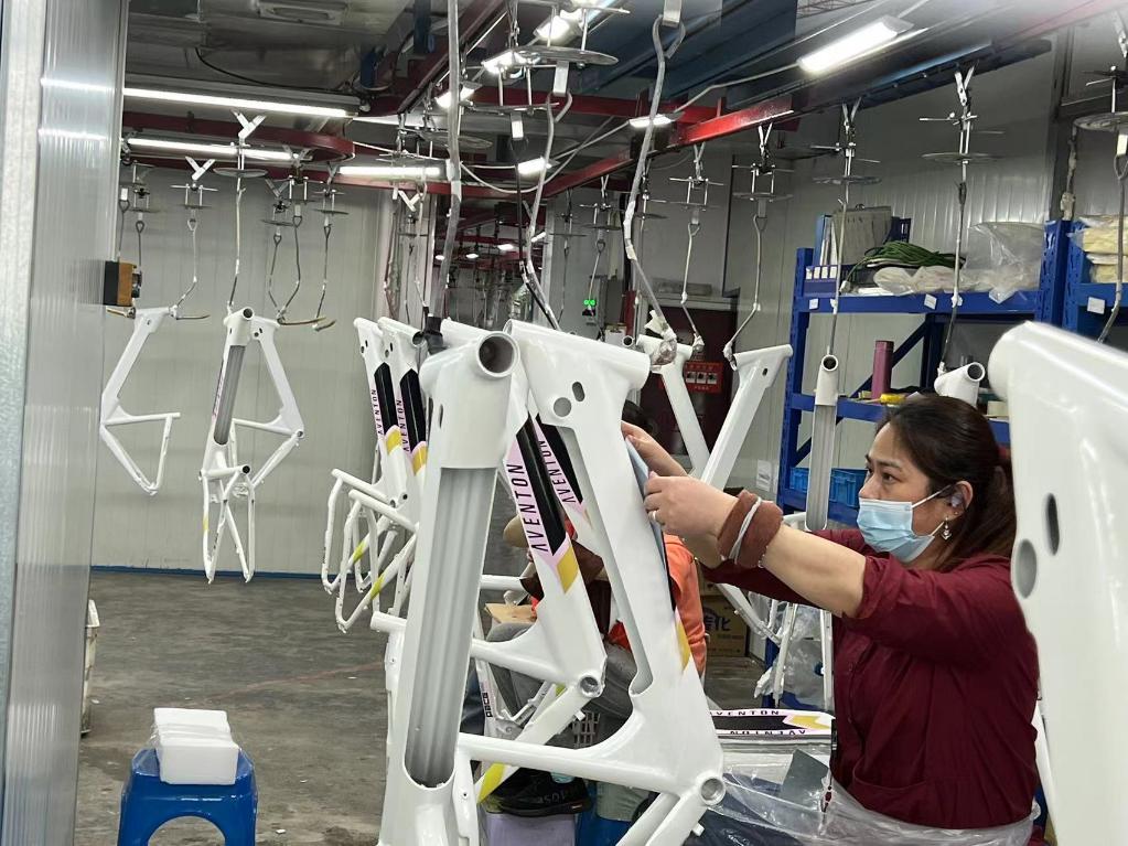 工人在為塑型好的車(chē)架貼膜。受訪(fǎng)企業(yè)供圖