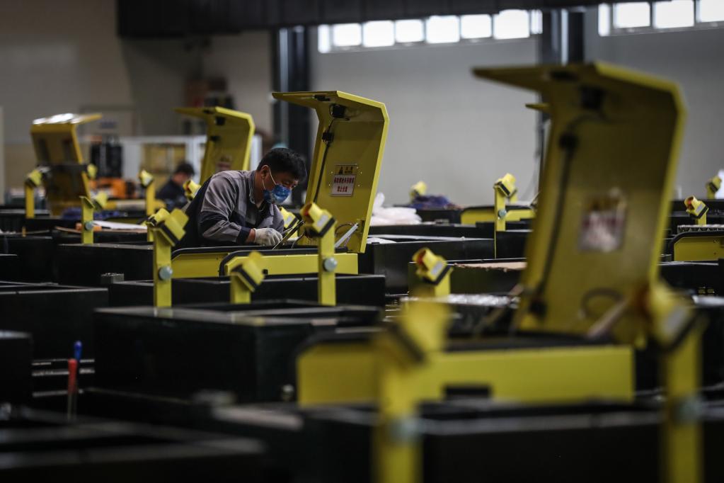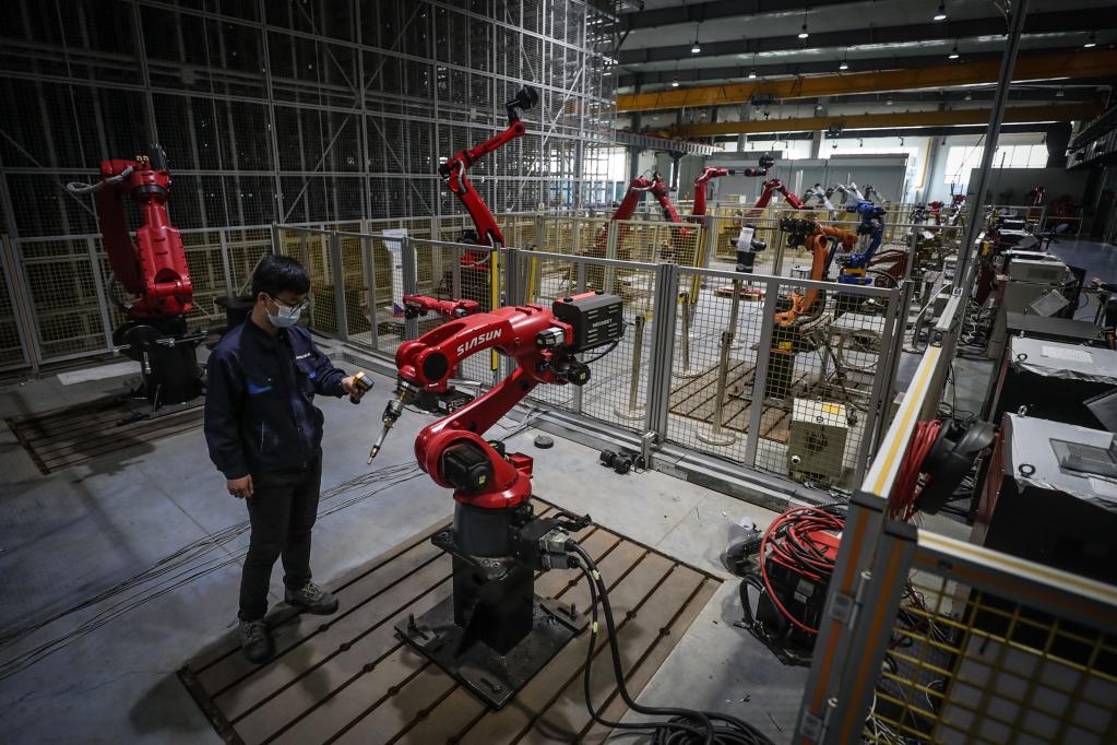 工作人員在生產(chǎn)車(chē)間內調試機器人。 新華社記者潘昱龍 攝