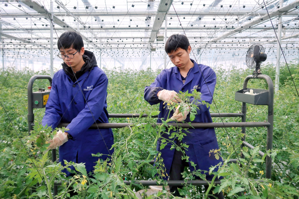 2021年3月4日,浙江省壽昌縣農業(yè)精品生態(tài)園的技術(shù)員在機器協(xié)助下為農作物綁蔓。新華社記者 鄭夢(mèng)雨 攝