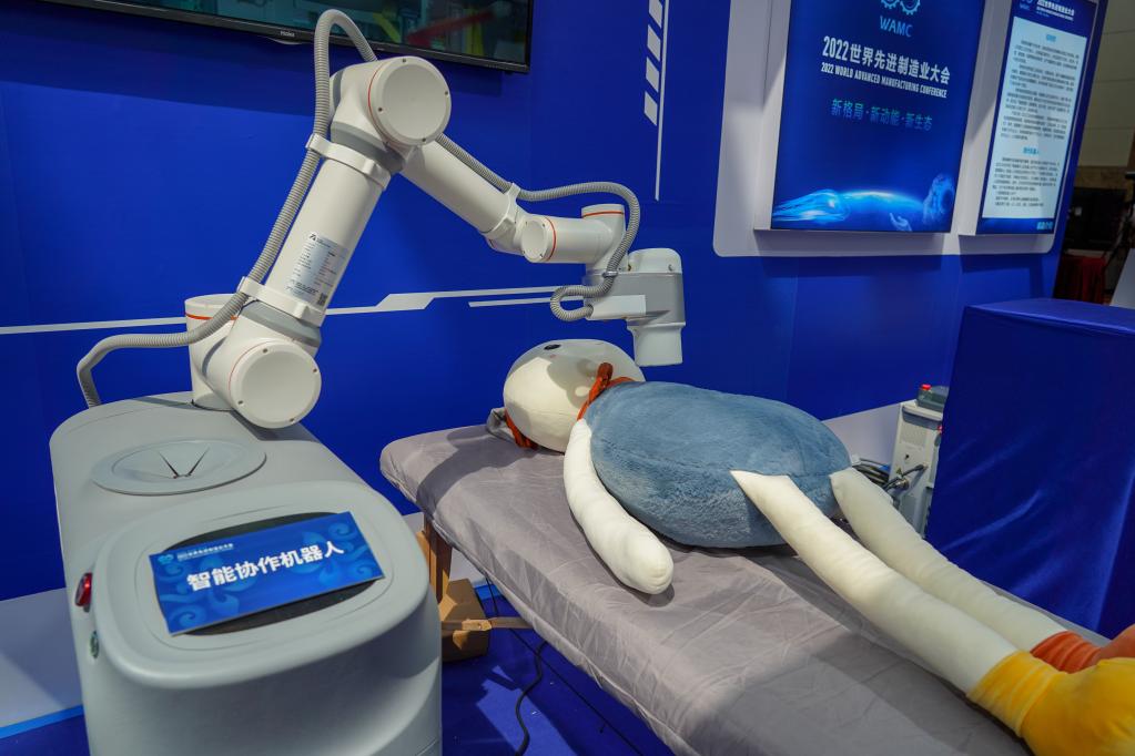 圖為紐氏達特機器人系統技術(shù)有限公司在2022世界先進(jìn)制造業(yè)大會(huì )上展示的智能協(xié)作機器人正在模擬艾灸。新華社記者朱崢 攝