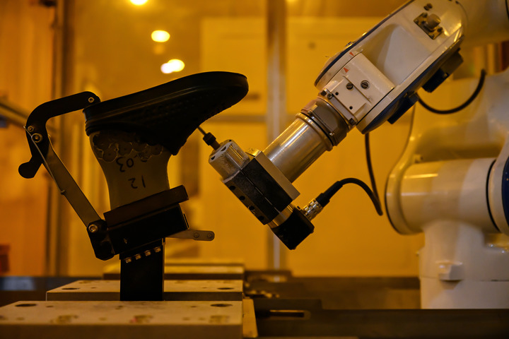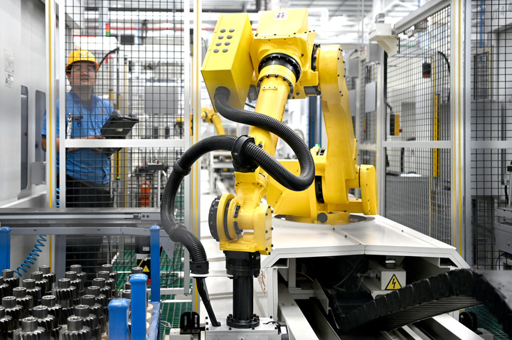 在晉江市茂泰鞋材有限公司的智能化生產(chǎn)車(chē)間,機械臂在進(jìn)行花園鞋自動(dòng)打孔作業(yè)(2022年5月12日攝)。新華社記者 周義 攝