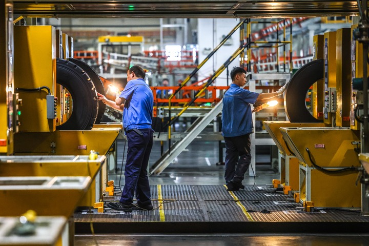 工作人員在貴州輪胎股份有限公司“5G全連接工廠(chǎng)”的檢驗區內工作(5月17日攝)。新華社記者 歐東衢 攝