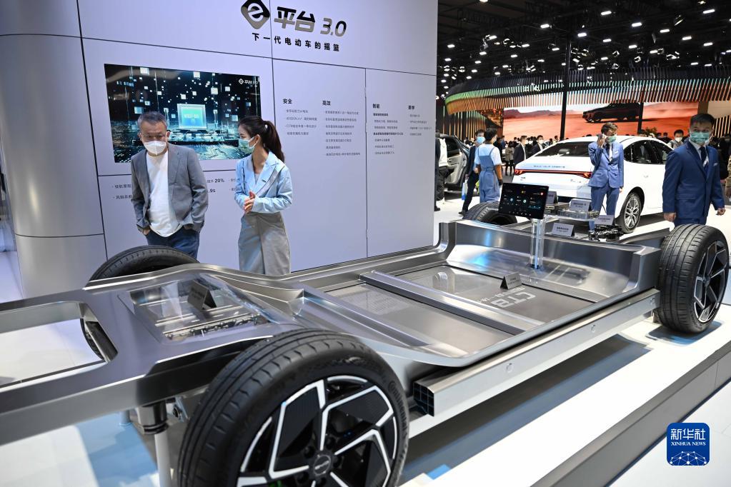 在第二十屆廣州車(chē)展,參觀(guān)者了解比亞迪電動(dòng)車(chē)平臺3.0(2022年12月30日攝)。新華社記者 鄧華 攝