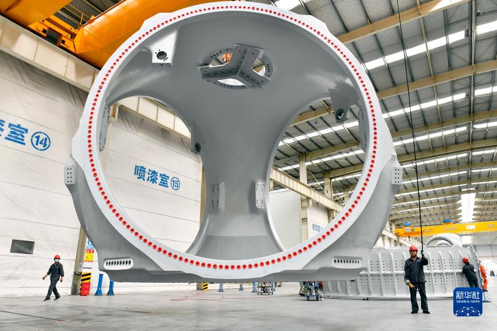 工作人員在山東省惠民縣風(fēng)電裝備產(chǎn)業(yè)基地一涂裝車(chē)間內作業(yè)(2022年6月7日攝)。新華社記者 郭緒雷 攝