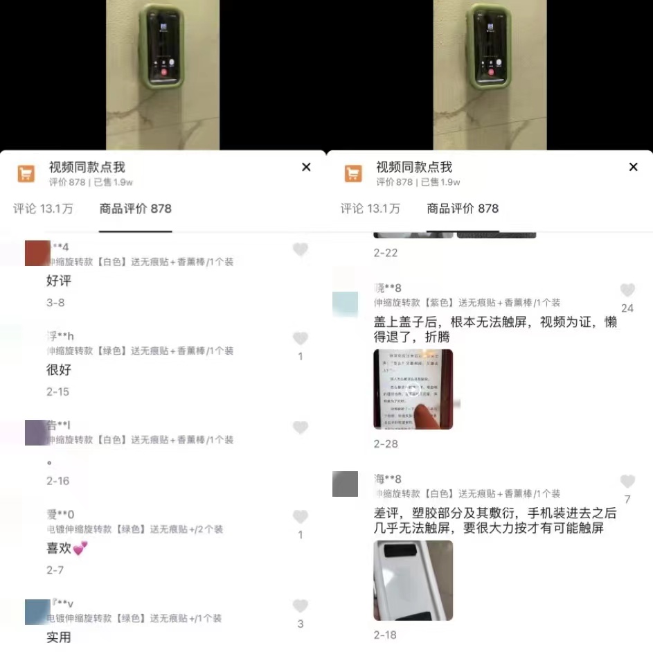 圖為某短視頻平臺銷(xiāo)售的防水支架,前期大量“好評”引流,真實(shí)評價(jià)不佳。