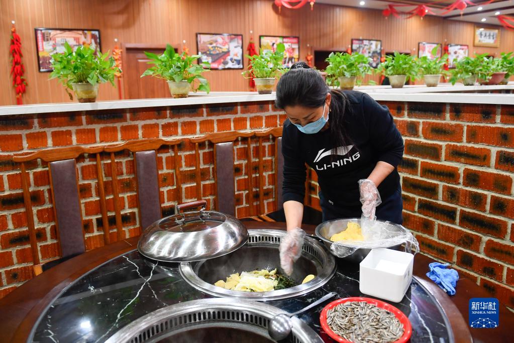在吉林省吉林市永吉縣北大湖鎮南溝村,一家農家樂(lè )的經(jīng)營(yíng)者為客人準備菜品(2022年11月21日攝)。新華社記者 許暢 攝