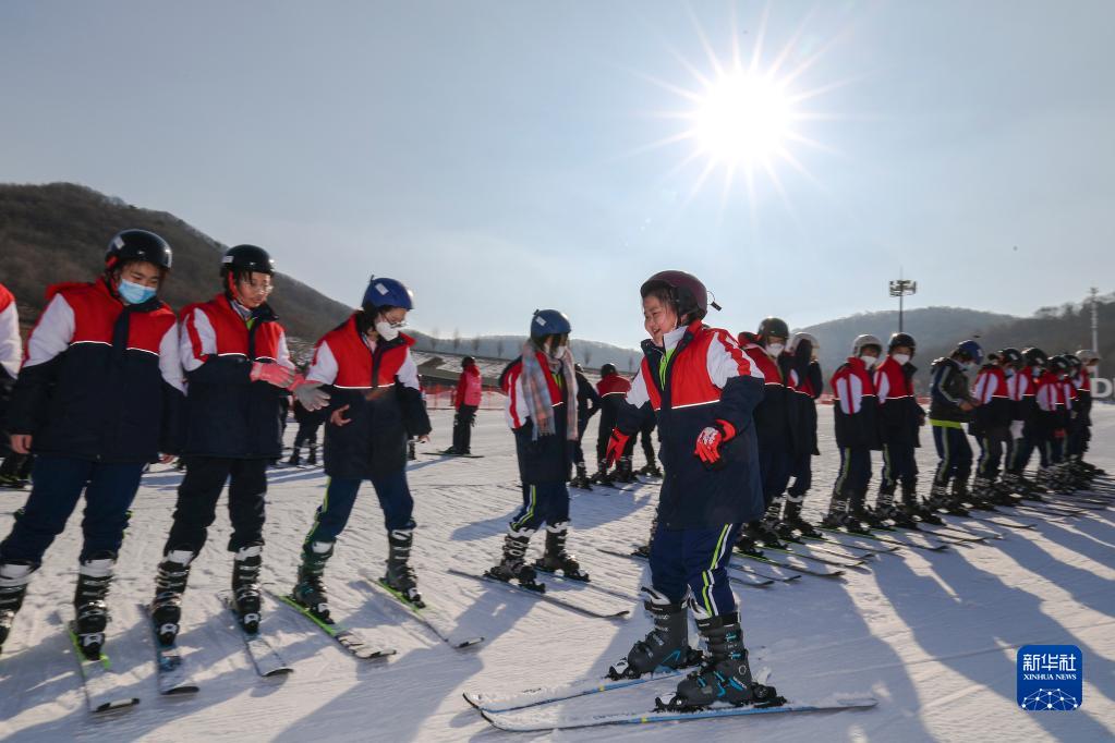 在吉林省吉林市萬(wàn)科松花湖度假區,吉化第九中學(xué)學(xué)生在滑雪體育課上練習(2月27日攝)。新華社記者 許暢 攝