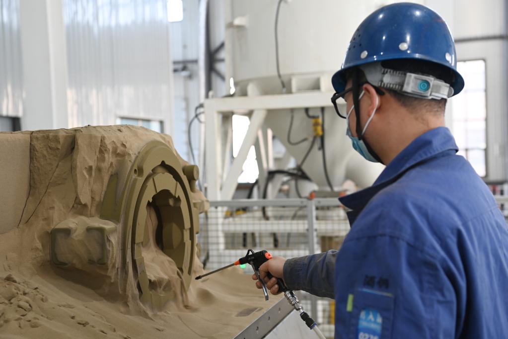 3月6日,在西部重工公司3D打印智能鑄造工廠(chǎng),工作人員正在清理剛剛完成的3D打印砂型鑄件。新華社記者范培珅 攝