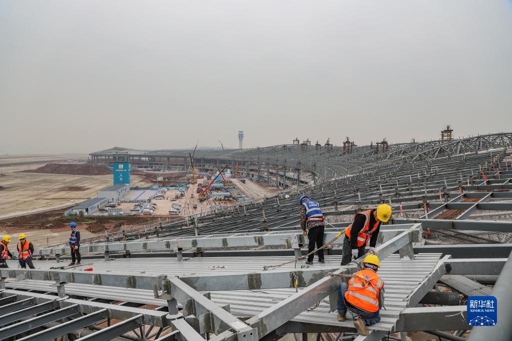 2023年2月16日,施工人員在中建八局承建的重慶江北國際機場(chǎng)T3B航站樓進(jìn)行屋面作業(yè)。新華社發(fā) (范聰 攝)