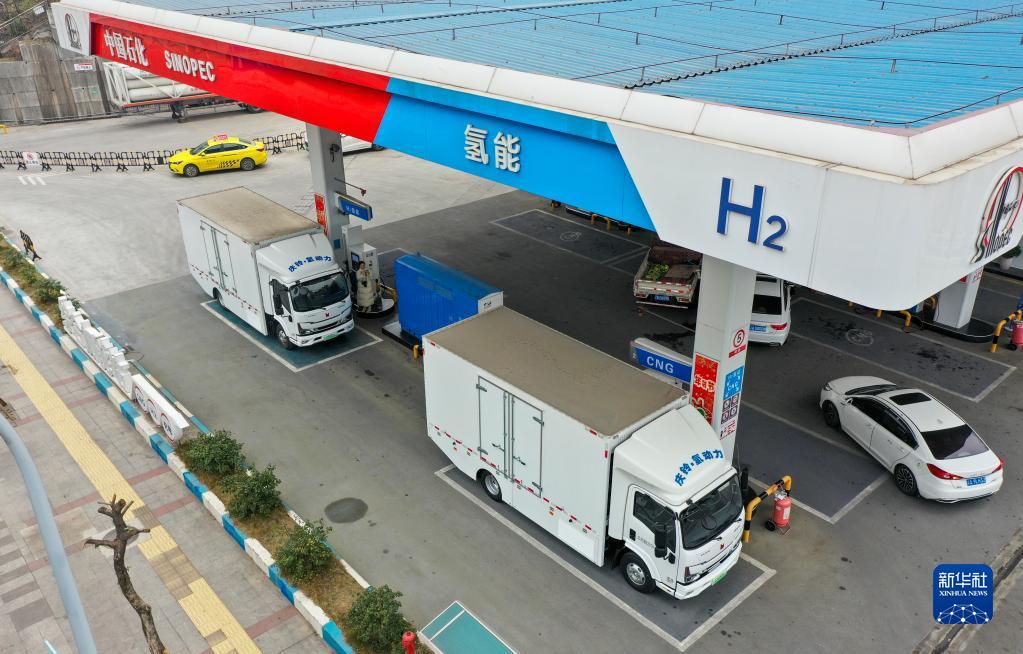 2023年2月8日,在位于九龍坡區的重慶首座加氫站內,兩輛氫動(dòng)力商用車(chē)在補充動(dòng)力(無(wú)人機照片)。新華社記者 劉潺 攝