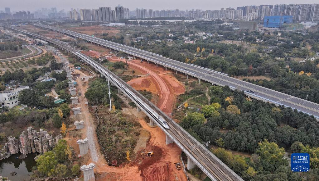 2022年12月12日,一列復興號列車(chē)行駛在成渝高鐵上(無(wú)人機照片)。新華社記者 劉坤 攝