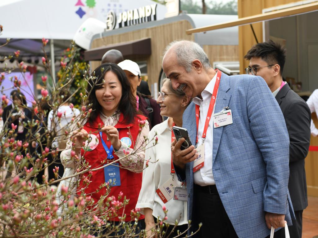 4月8日,中外嘉賓在2023粵港澳大灣區花展現場(chǎng)賞花。新華社記者梁旭 攝