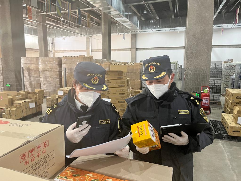 圖為曹妃甸海關(guān)關(guān)員查驗跨境電商商品。(于佺 攝)
