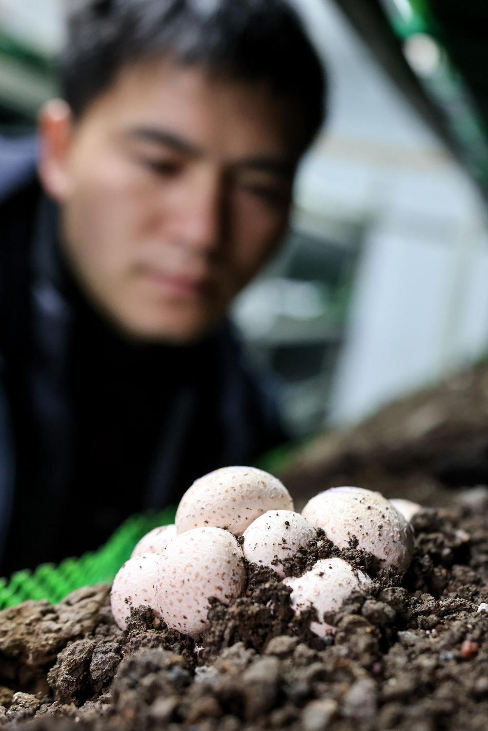 工作人員在貴陽(yáng)市白云區食用菌產(chǎn)業(yè)示范園智能菇房?jì)炔榭淳缴L(cháng)情況(2022年2月14日攝)。新華社記者 歐東衢 攝