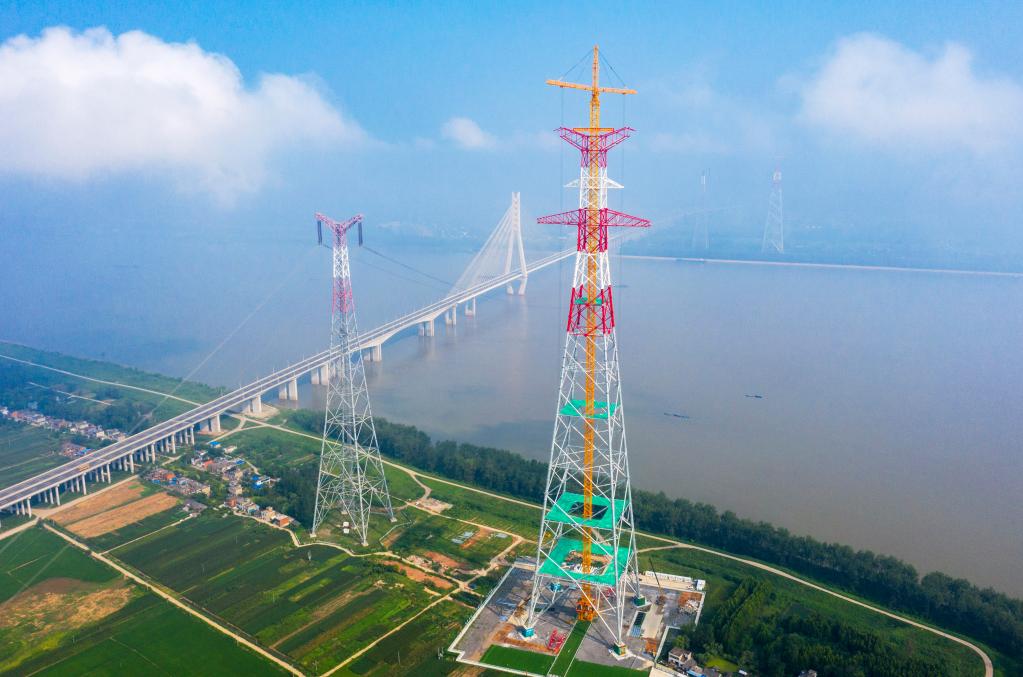 2022年8月1日在安徽省池州市貴池區的長(cháng)江岸邊拍攝的池州長(cháng)江大跨越輸電塔(無(wú)人機照片)。