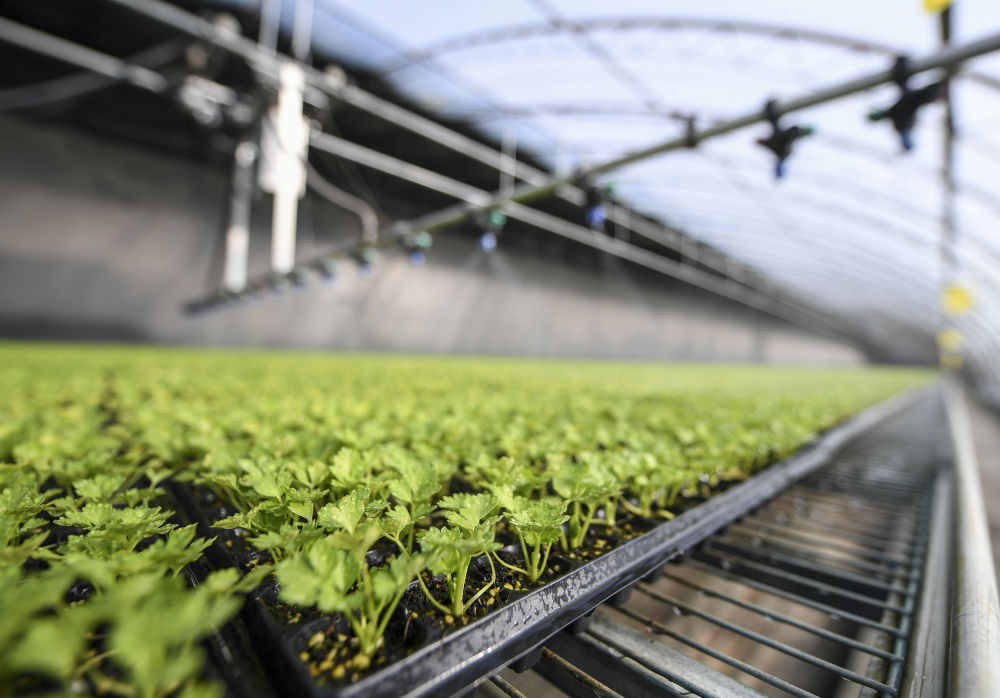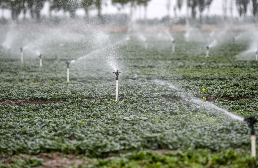 寧夏銀川市賀蘭縣景沃佳禾種苗繁育基地的水肥一體式噴灌機在給西芹幼苗補水施肥(2月1日攝)。新華社記者 馮開(kāi)華 攝